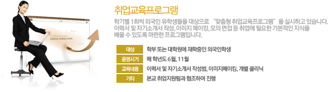 | 취업교육프로그램 | • Communication 및 Presentation Skill • 이력서 및 자기소개서 작성법 • 기본적인 면접에서의 요령 • 모의 인터뷰를 통한 개별 클리닉 | 학기별 1회 | 60명 (학기별 30명) | 10시간 |
